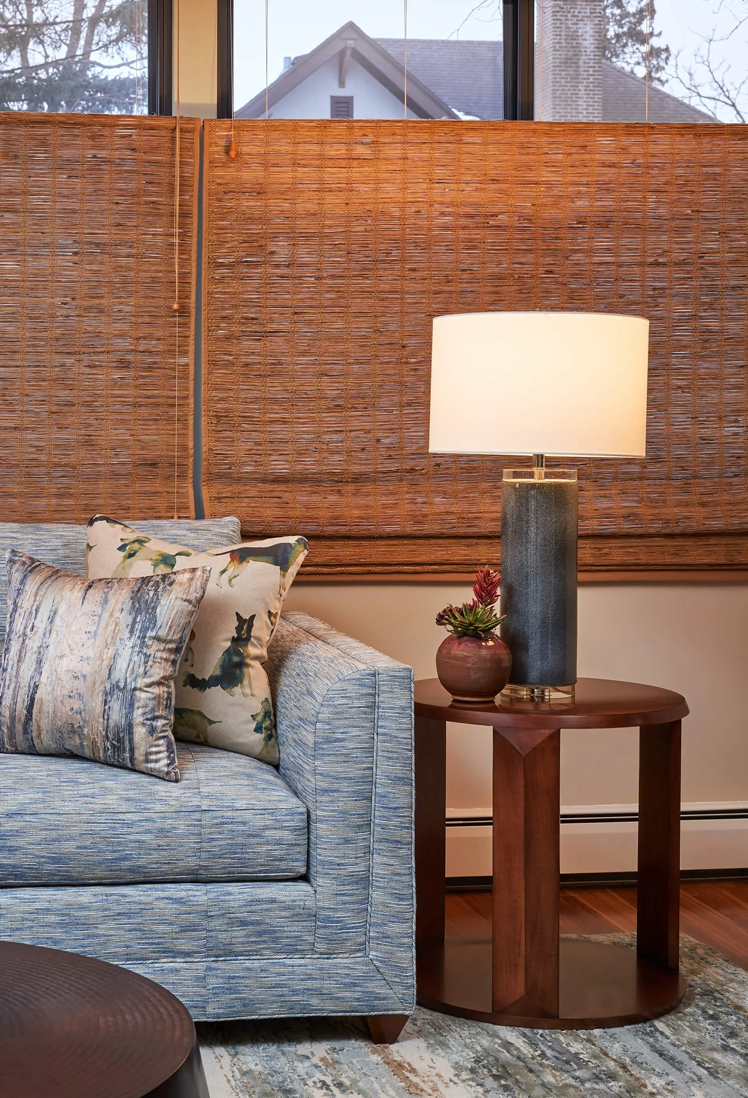 We enhanced the texture of the space by adding woven shades that gave our client light control and privacy while also complementing the condo’s natural light. Our firm designed a custom rug featuring subtle undulating waves of color that tied the design together.