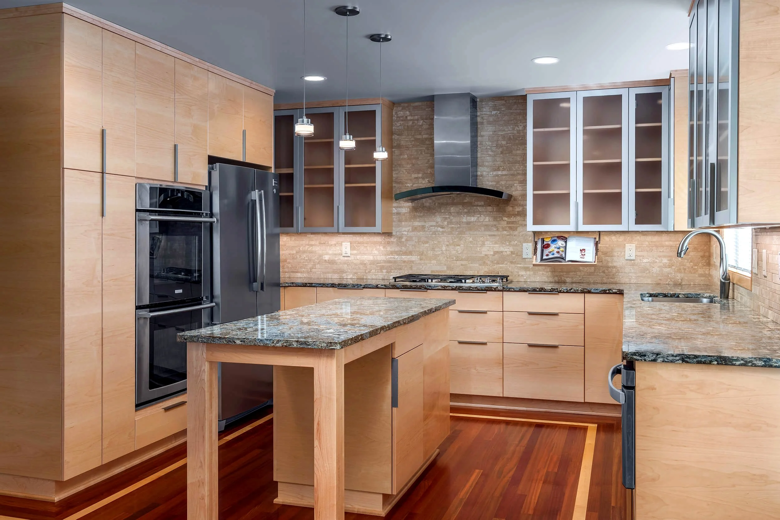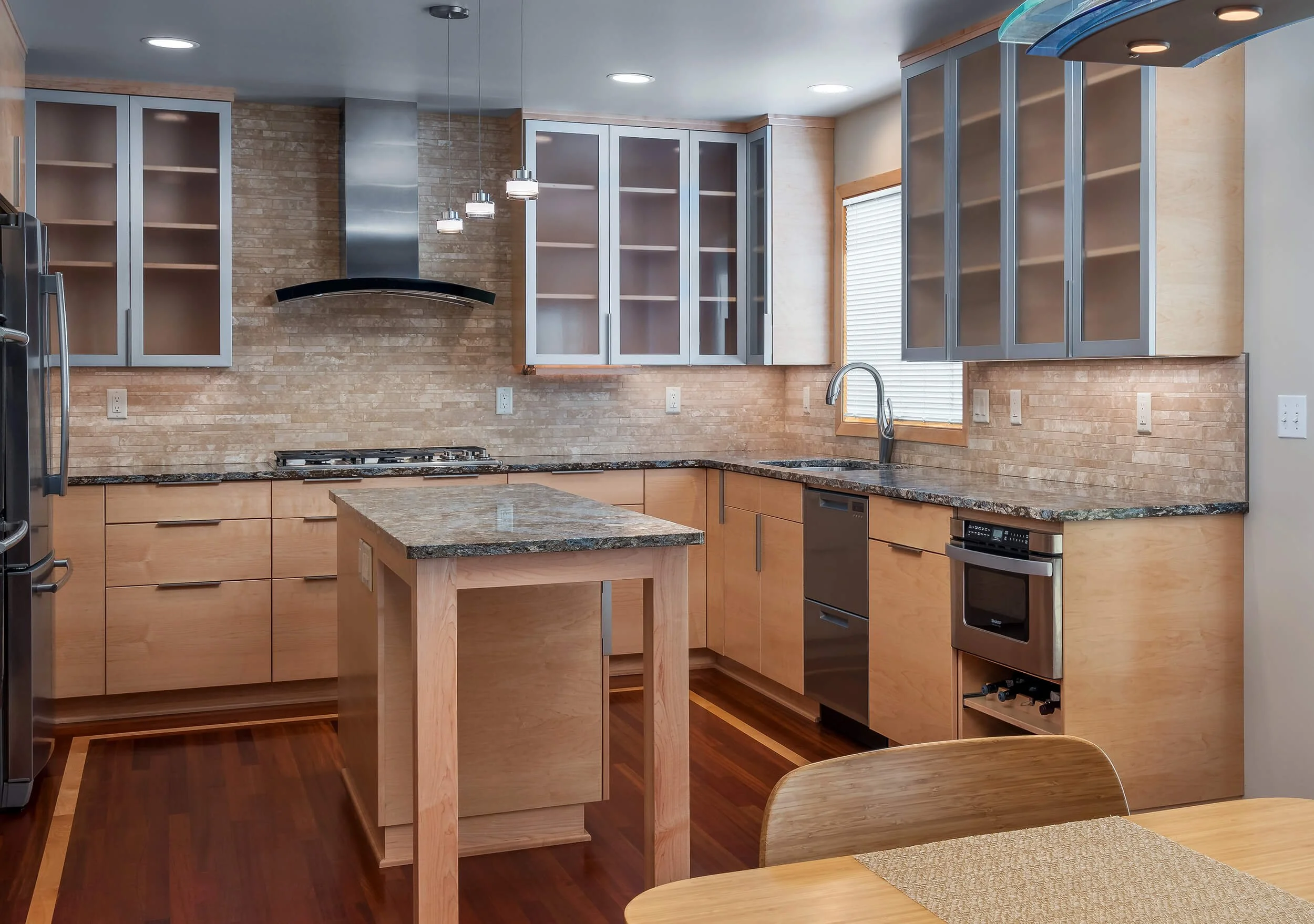 Our firm extended the home’s beautiful walnut flooring with maple inset into the kitchen, seamlessly feathering in the new walnut to unify the space.