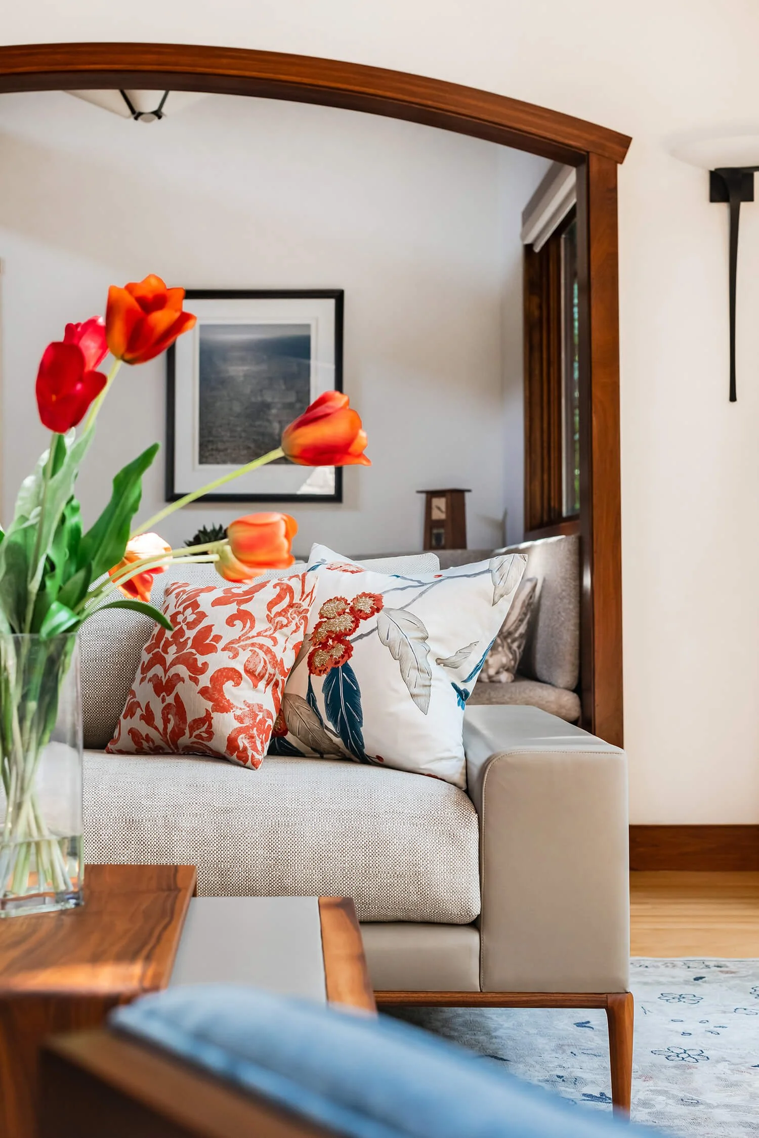 As blue was our client's favorite color, a reflection of the waters of Lake Superior, we paired it with oranges and complementary tones and neutrals to enhance and bring to life her vision, while still paying homage to the home’s architectural heritage