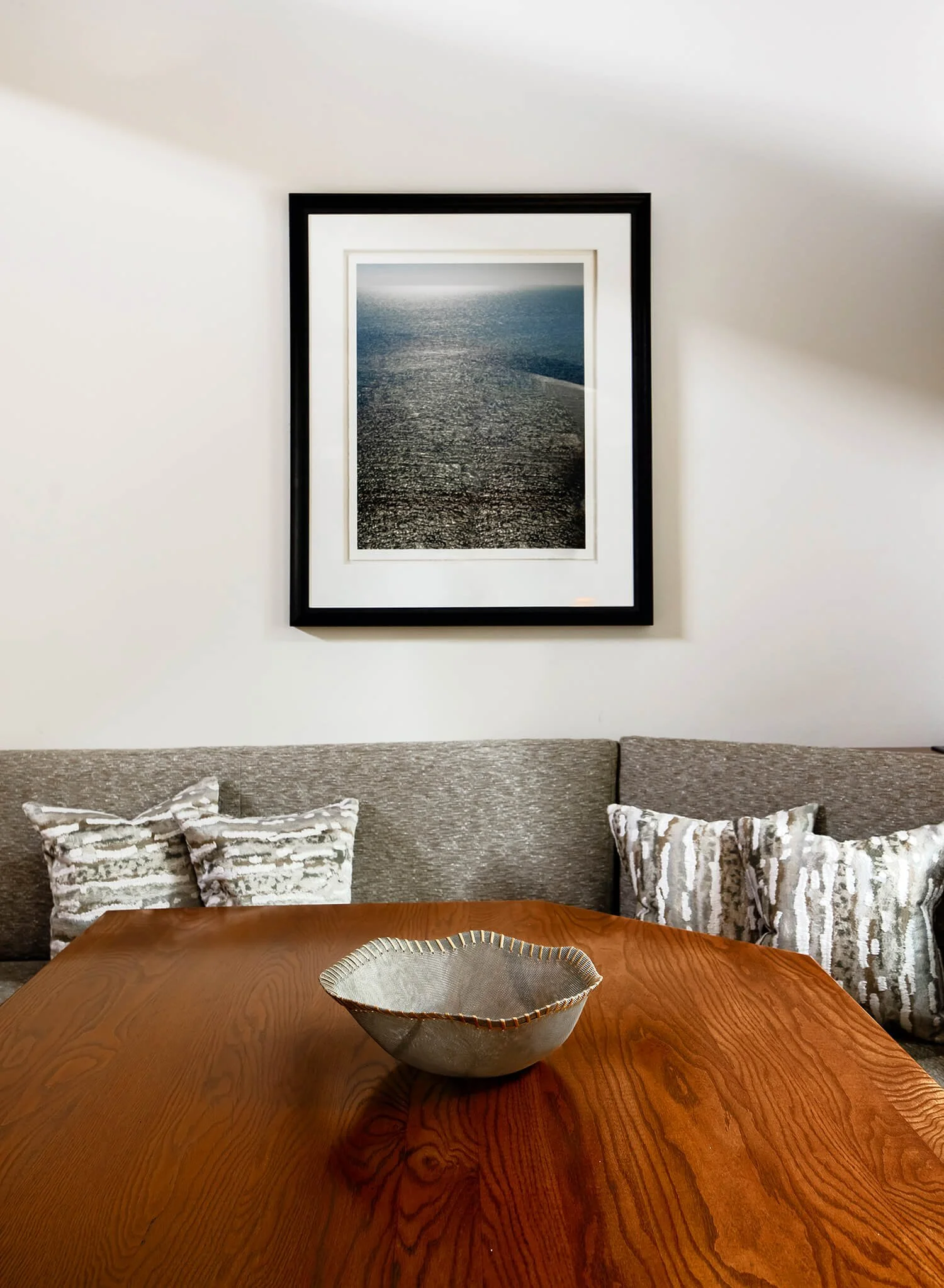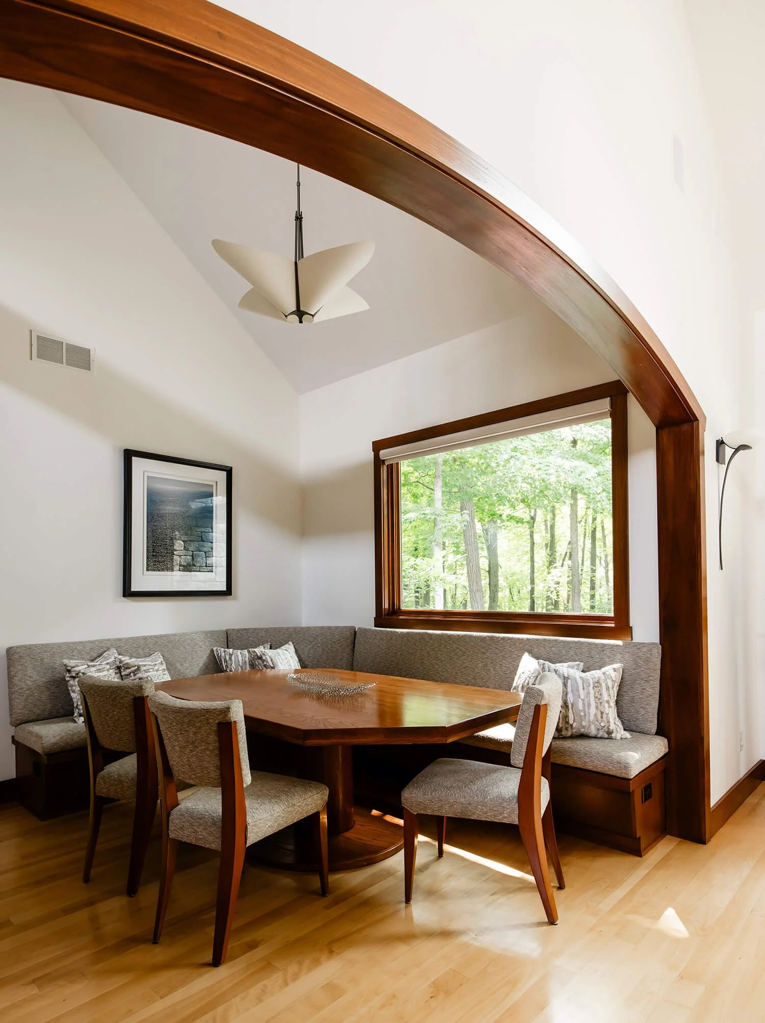 We collaborated with a trusted craftsman to create custom elements for the home—such as an artisan-crafted banquette and table base designed to complement a tabletop built from trees felled during the home’s original construction—honoring the home’s history and architecture.