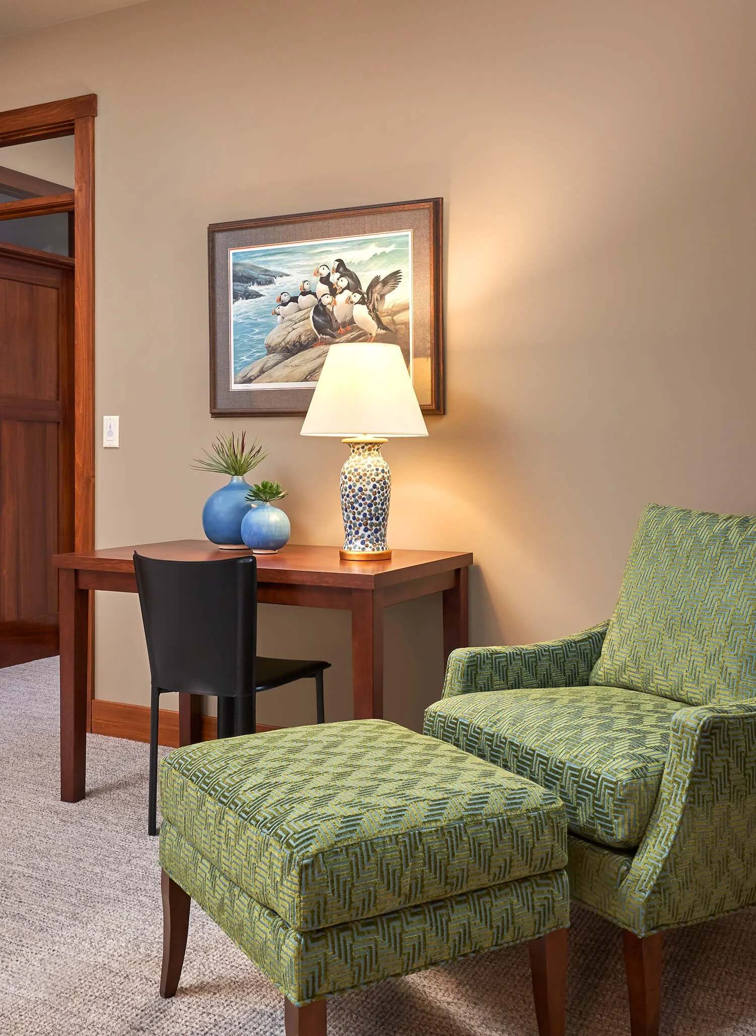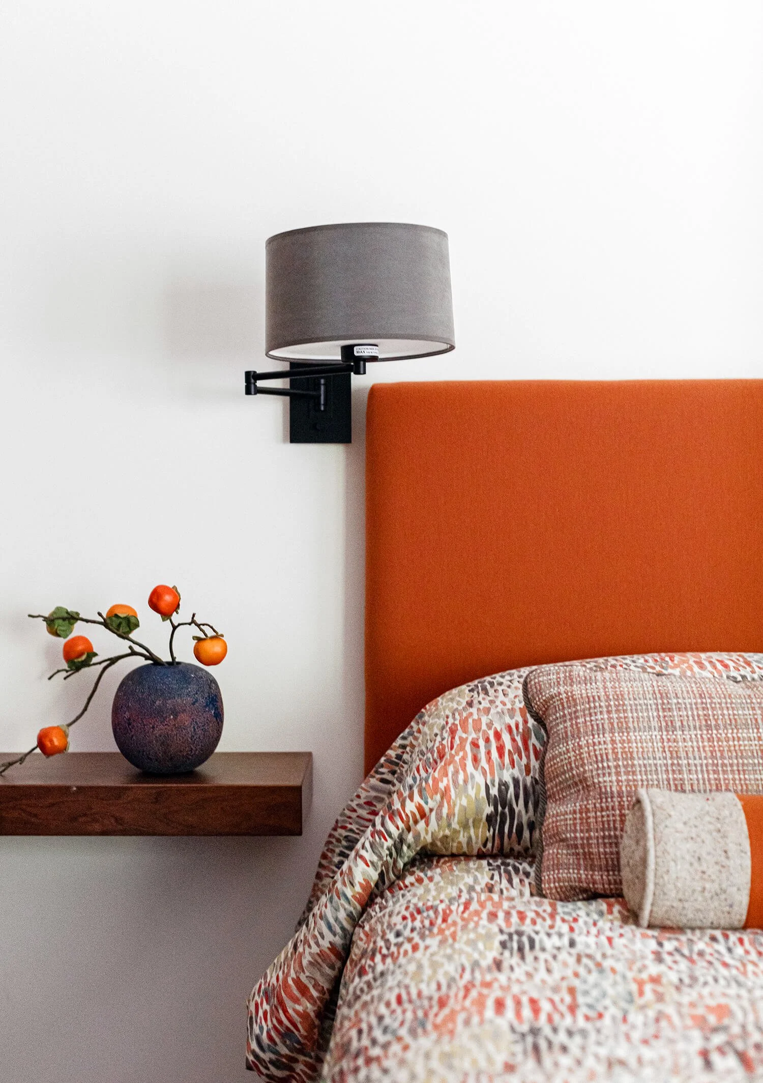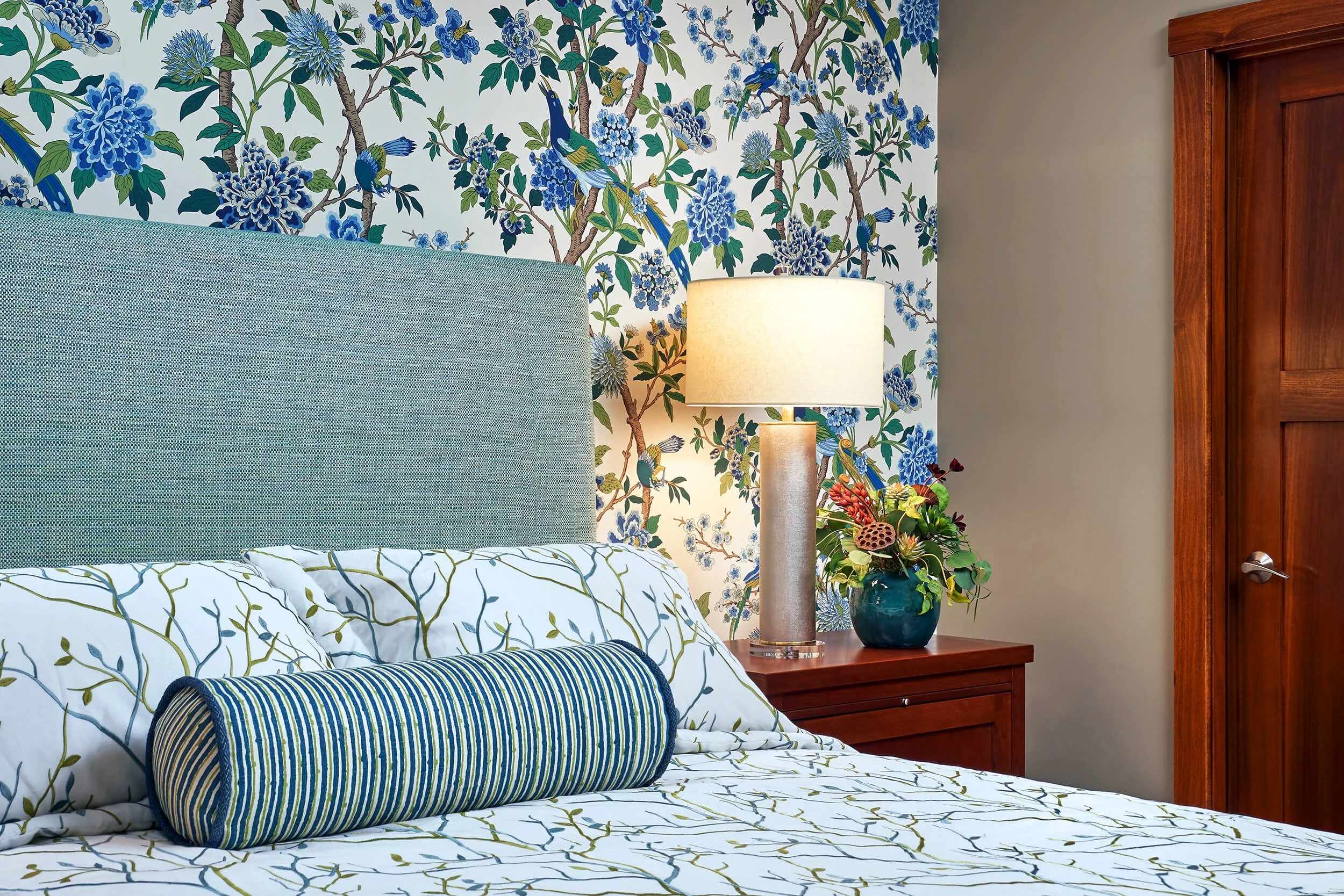 We added richer color to the room with vibrant wallpapers with hues that coordinated with the wool carpeting to give the bedroom a feeling of effortless cohesion.