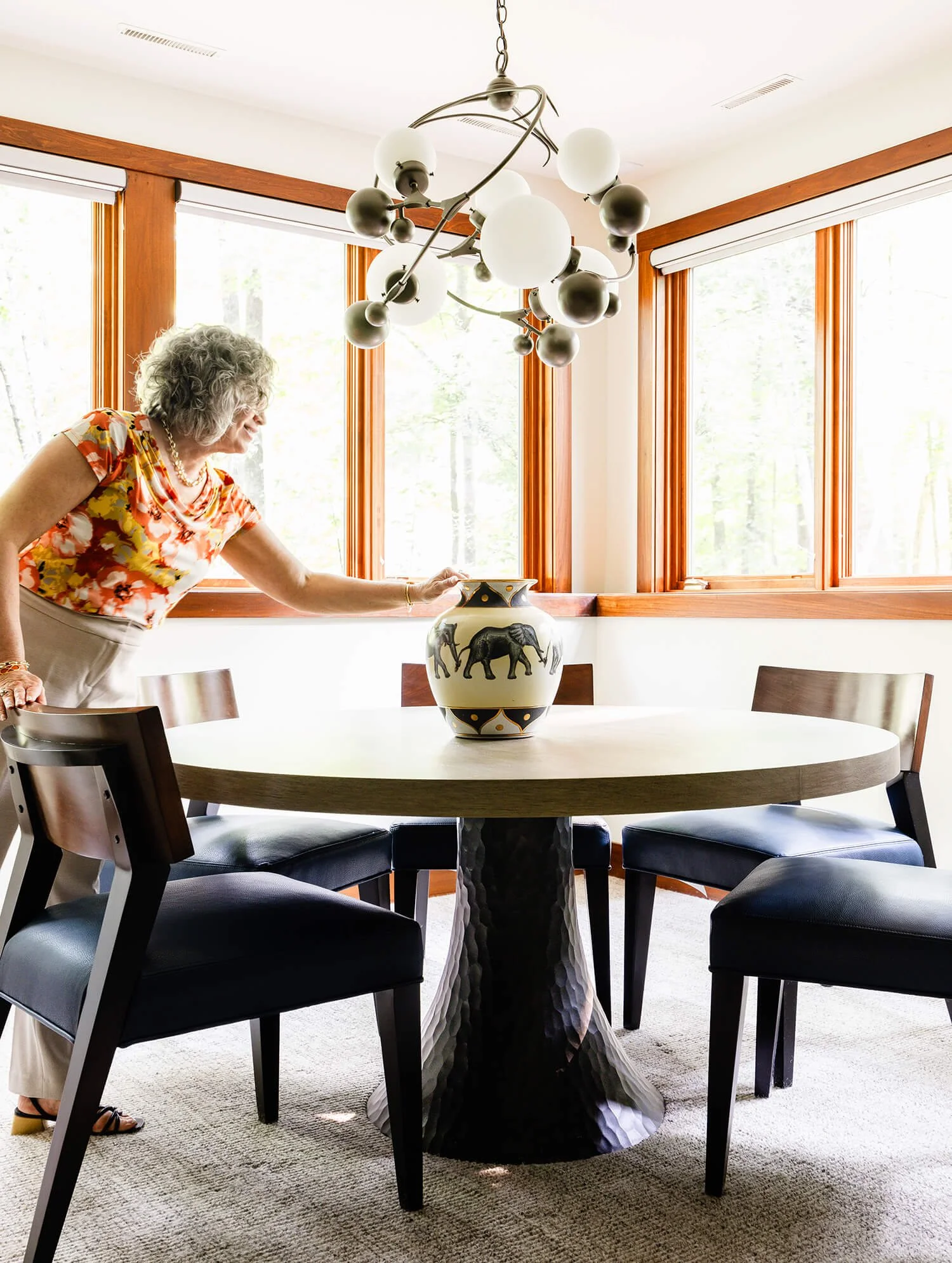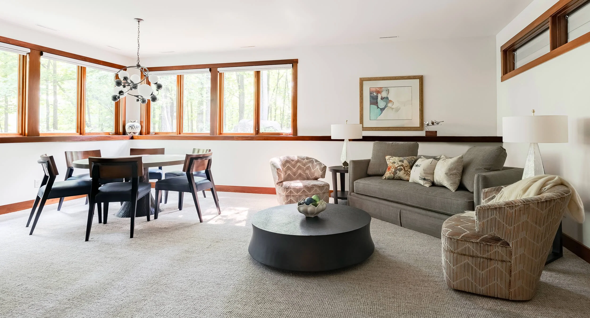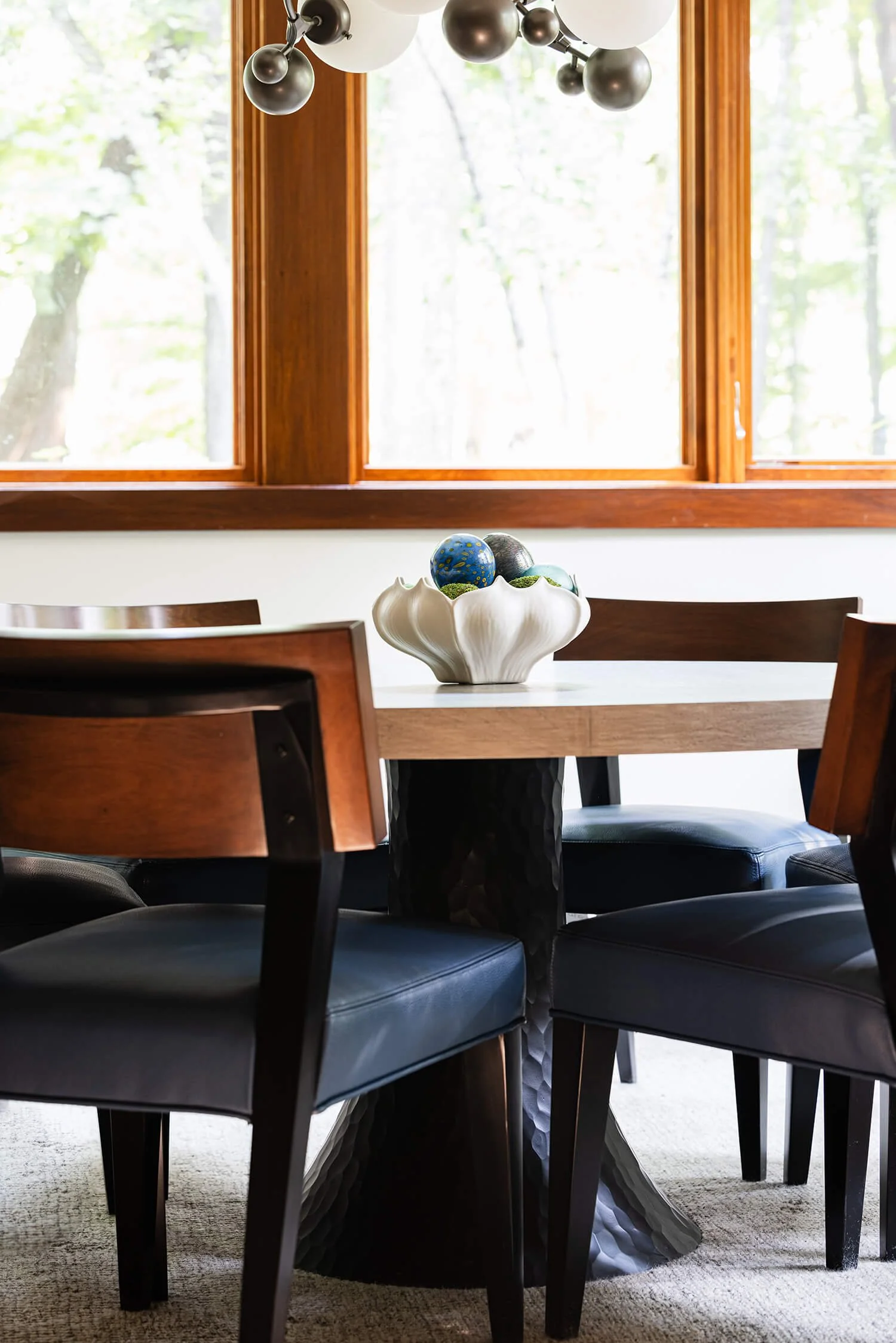 SKC Design transformed the home’s lower level and dining area by addressing a fundamental challenge: The original TV and sound system placement disrupted a cohesive seating flow. We collaborated with our trusted cabinetmaker to design and install a new television entertainment center, relocating it to the opposite side of the room.