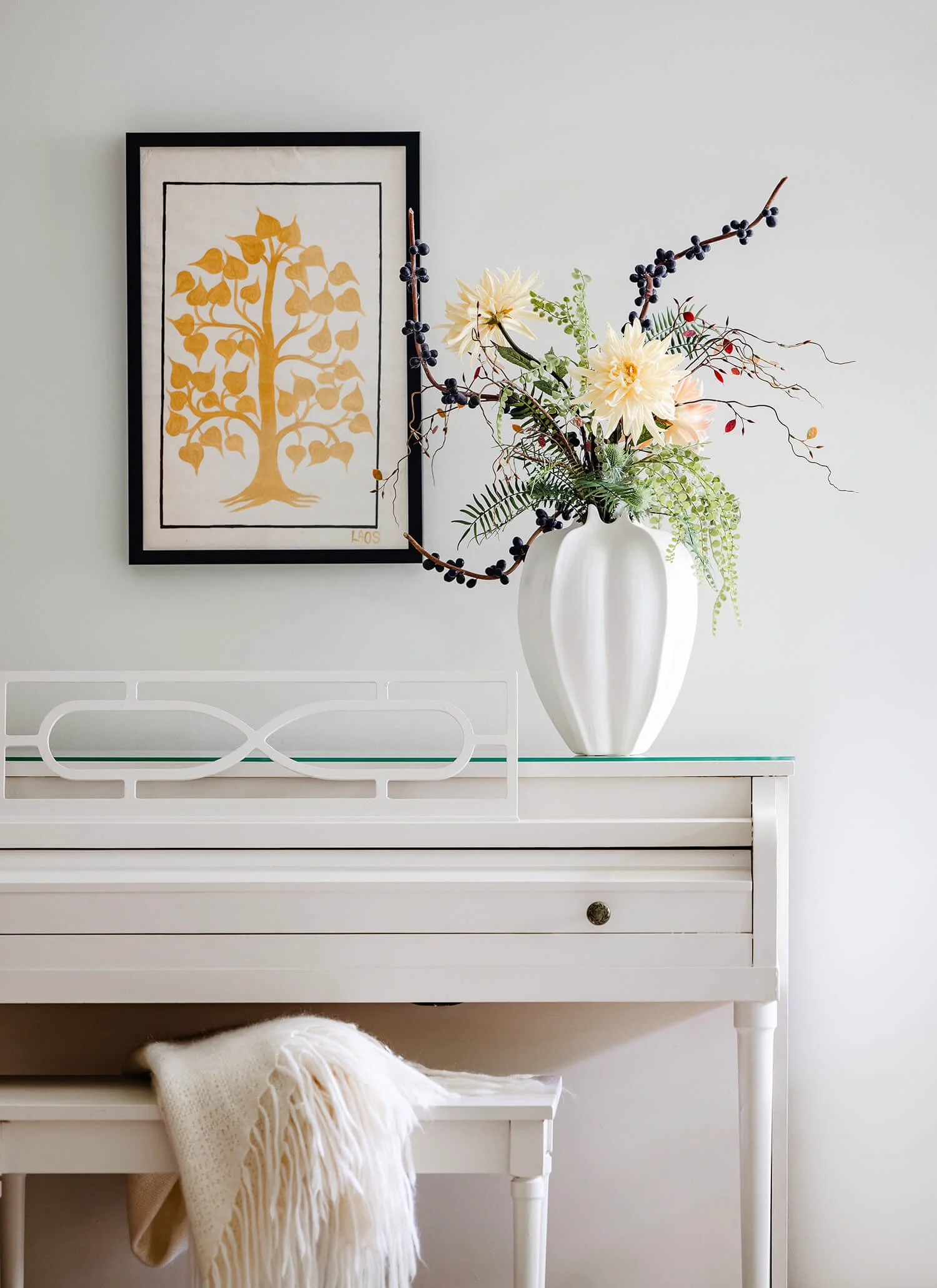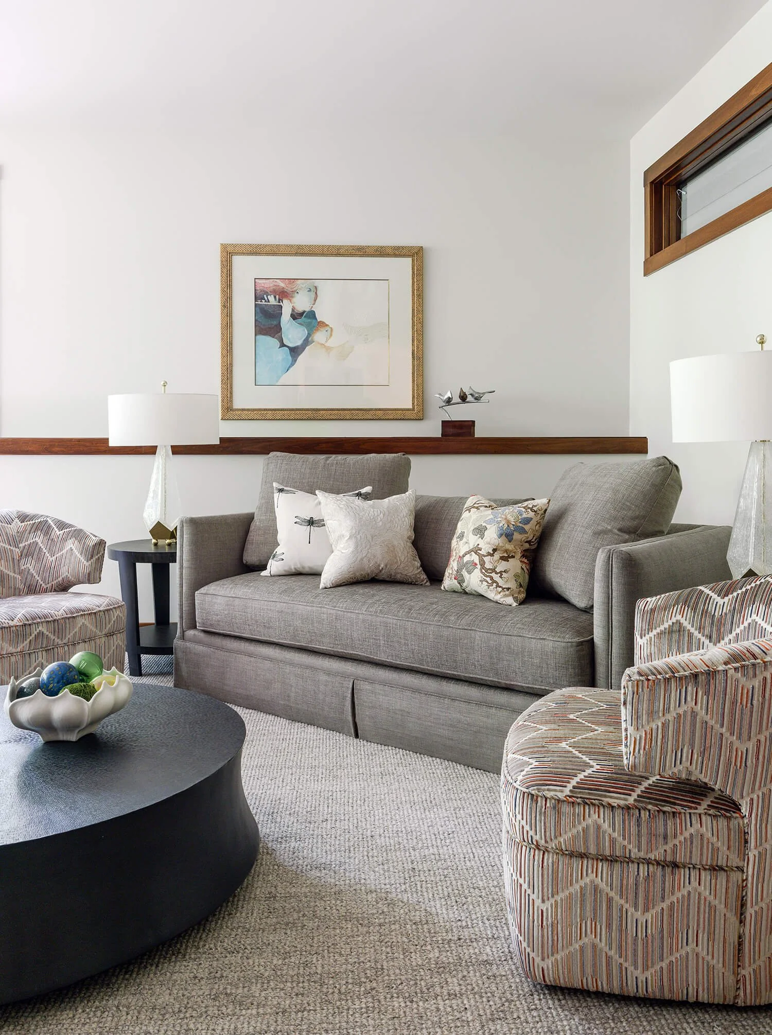 Key elements of the client’s lower level—a copper cocktail table, artwork honoring a lost loved one, and her mother’s piano—became integral threads that tied the entire design together. This space weaves in subtle hints of orange and blue, echoing the design language established in the rest of the home.