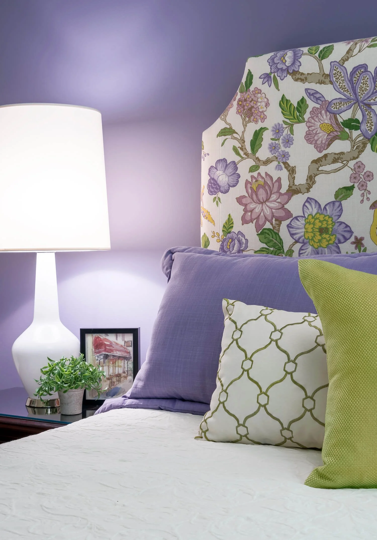 To breathe new life into the space, SKC Designs collaborated with a fabricator for a custom headboard with fabric that was durable, beautiful, and a nod to England. The exquisite English patterns, paired with Benjamin Moore's Faded Violet in the premium Aura formula, and custom bedding and upholstery, transformed the bedroom into a serene and sophisticated retreat.
