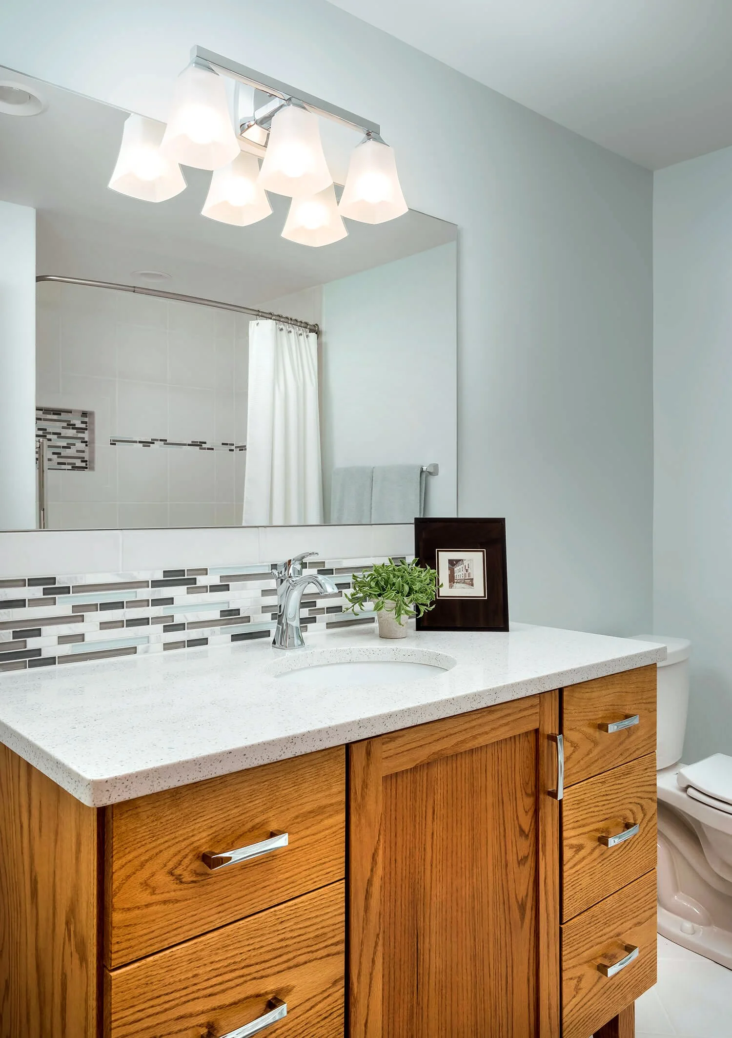 Beyond the master bedroom, we did a full remodel of the guest bathroom. We partnered with our trusted cabinetmaker to design a custom vanity and thoughtfully selected faucets, fixtures, tile, and lighting for a custom blend of luxury and sustainability.